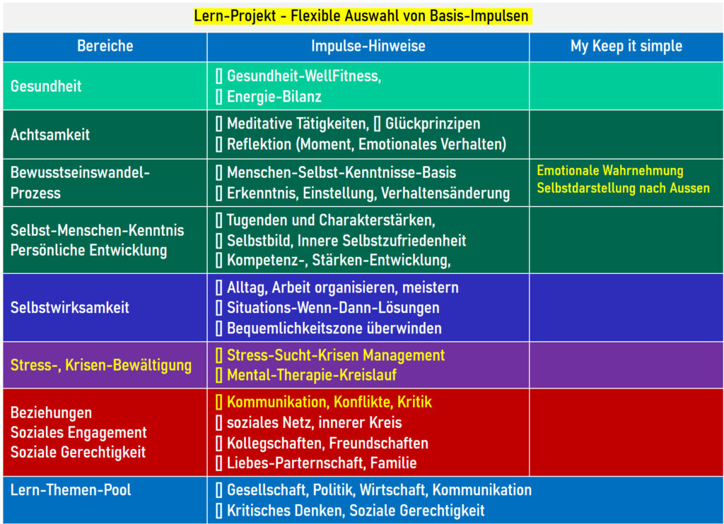 | Persönliche Entwicklung | () Selbstwirksamkeit [] Tugenden, Charakterstärken als Basis [] Kompetenz- und Talent-Enwicklung [] Innere Selbstzufriedenheit |