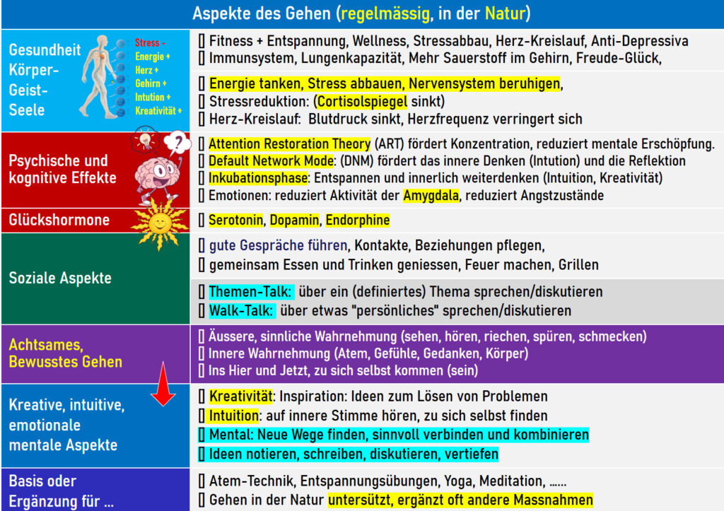 | Hinweise | [] GEHEN IN DER NATUR (Synergie-Walk) [] Wandern in der Region [] Meditative Tätigkeiten |