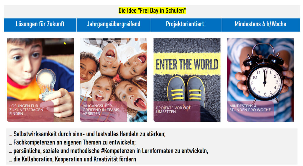 „Frei Day in Schulen“ ist die Idee, dass sich die Schüler:innen jede Woche selbstbestimmt an einem „Projekt“ lernen können, um ihre Zukunft sinnvoll zu gestalten.