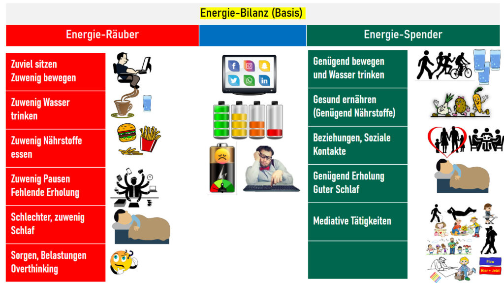 | [] zu wenig Bewegung, zu viel Sitzen [] zu wenig Wasser trinken [] nicht ausreichend erholsamer Schlaf [] zu viel Alkohol und zuckerhaltige Getränke [] schlechte Ernährungsgewohnheiten, [] fehlende Nährstoffe [] keine oder zu wenig Erholungsphasen | [+] ausreichende Alltagsbewegung, [+] die uns Spaß macht [+] ausreichend erholsamer Schlaf [+] ausreichend gutes Wasser trinken [+] ausgewogene Ernährung, [+] die uns mit wichtigen Nährstoffen versorgt [+] ausreichende Erholungsphasen im Alltag [+] Säge schärfen |