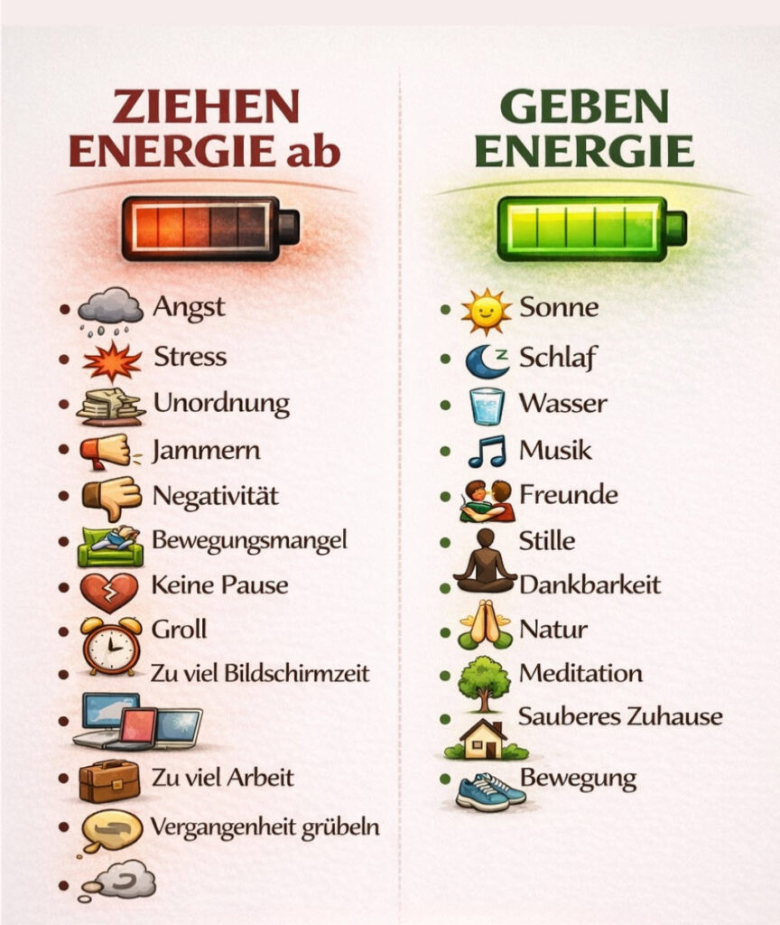 | [] ein Umfeld, sei es privat oder beruflich, [] in dem wir uns nicht wohlfühlen [] zu viele negative soziale Kontakte [] übermäßiges Fernsehen-surfen [] und ständige Handyerreichbarkeit | [+] ein Umfeld, in dem wir uns wohlfühlen [+] und das wir mitgestalten können [+] positive soziale Kontakte, [+] die zu guter Laune beitragen [+] Familienleben und/oder ein Hobby zum [+] Ausgleich der täglichen Herausforderungen |