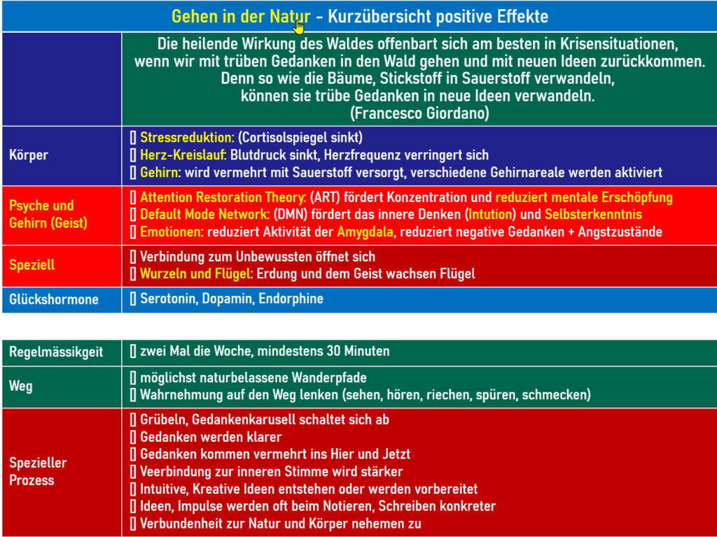 | Psychisch Kognitiv | [] Attention Restoration Theorie: Grübeln, Overthinking wird reduziert [] Default Mode Network: fördert das innere Denken und Intuition [] Spezielle Funktionen von DMN: fördern die Selbsterkenntnis [] Amygdala (Angstzentrum) wird beruhigt: negative Gedanken werden reduziert |