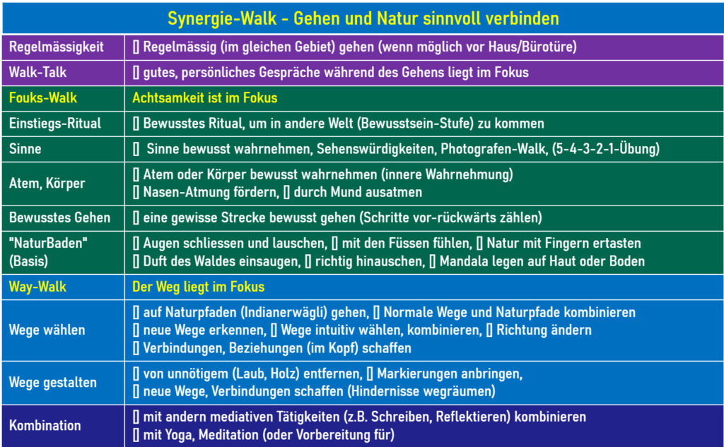 | Bewusst-Walk | [] eine bestimmte Strecke (Zeit, Länge, Schritte) [] bewusst gehen (Wahrnehmen was ist) |